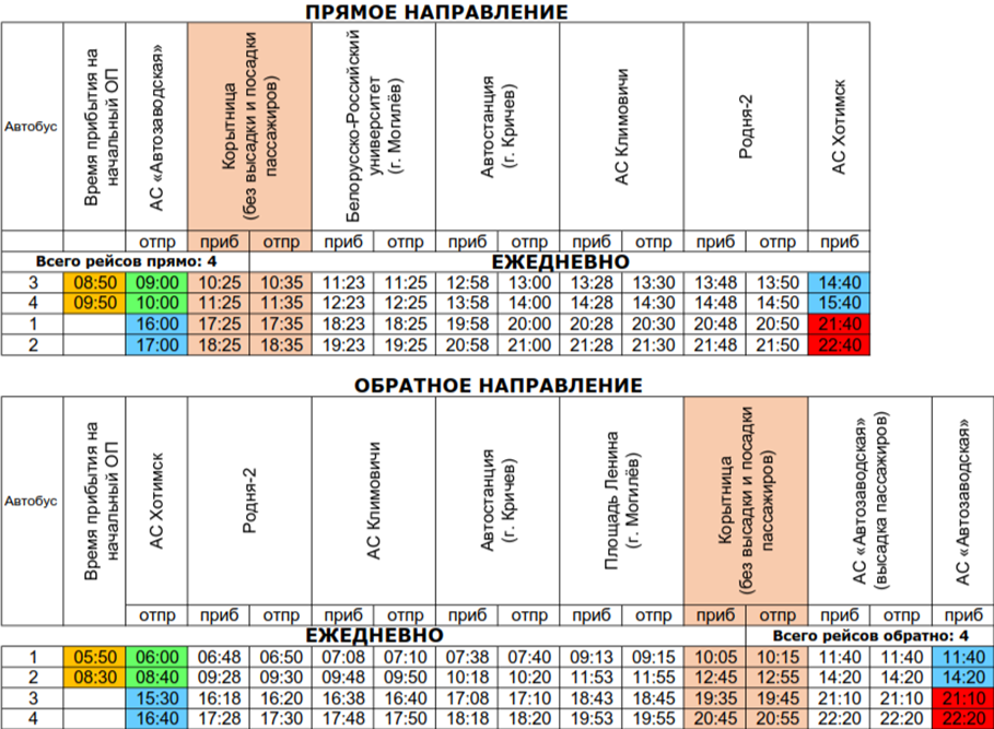 Информируем, что с 11.04.2026 на междугородном межобластном автобусном маршруте № 7608ТК «Минск – Хотимск» организуется выполнение остановочных пунктов «Родня-2» в аг. Родня, АС Климовичи в г. Климовичи, «Автостанция» в г. Кричев. Работа маршрута будет организована с выполнением отправлений, представленных ниже.