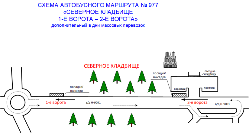 — только 21.04.2026 с 07:00 до 17:00 организуется дополнительный автобусный маршрут № 977 «1-е ворота – 2-е ворота» (Северное кладбище). Остановочные пункты для посадки: «1-е ворота», «2-е ворота».