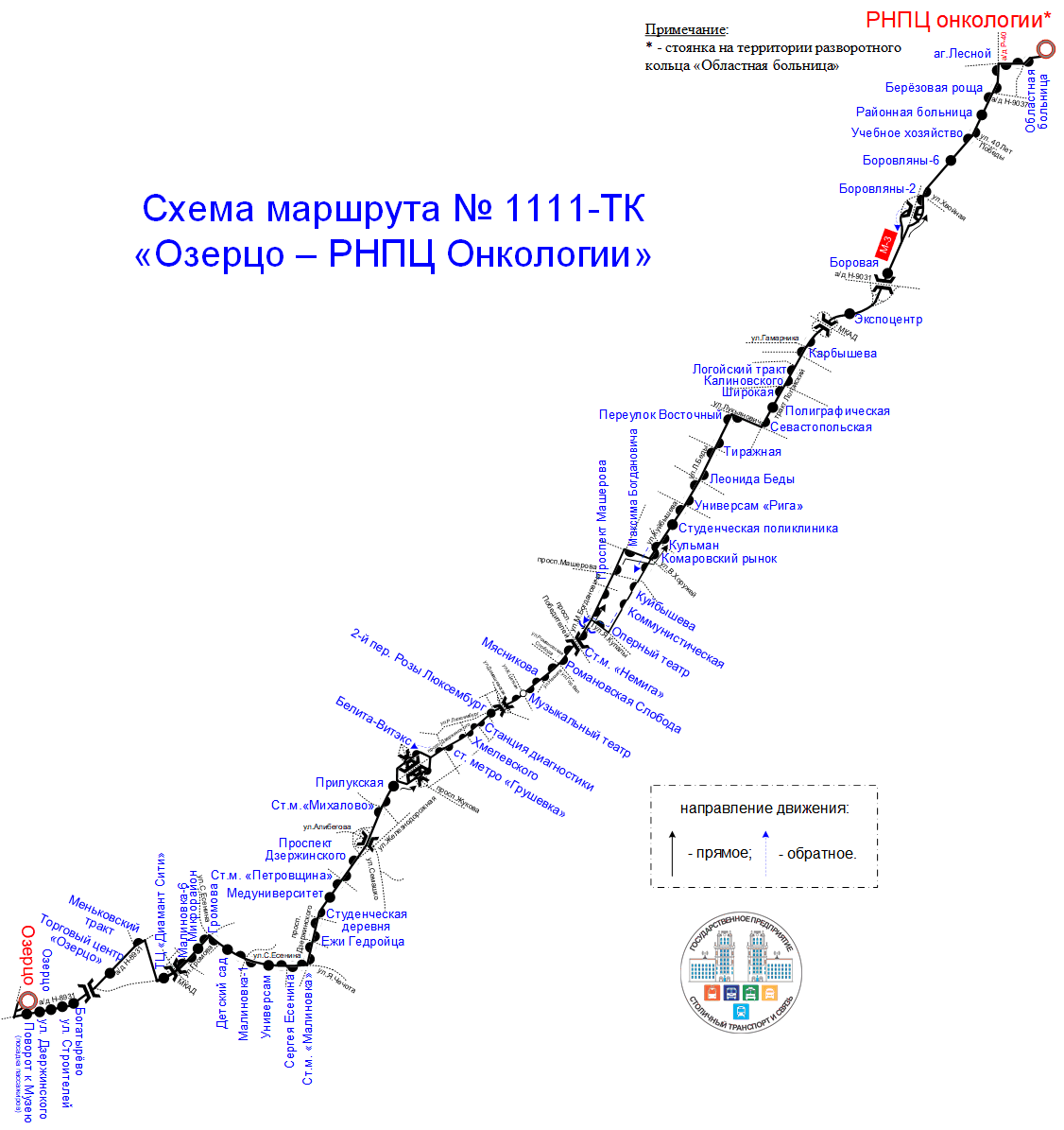 С целью повышения качества транспортного обслуживания пассажиров с 09.03.2026 вносятся изменения в схему и расписание движения городского экспрессного маршрута № 1111-ТК "Озерцо – РНПЦ онкологии" в части организации движения по пр. Дзержинского, ул. Немига и далее по маршруту с выполнением на изменяемом участке новых остановочных пунктов «Белита-Витэкс», «ст. метро Грушевка», «Хмелевского», «Станция диагностики», «2-й пер. Розы Люксембург», «Музыкальный театр», «Мясникова», «Романовская Слобода».